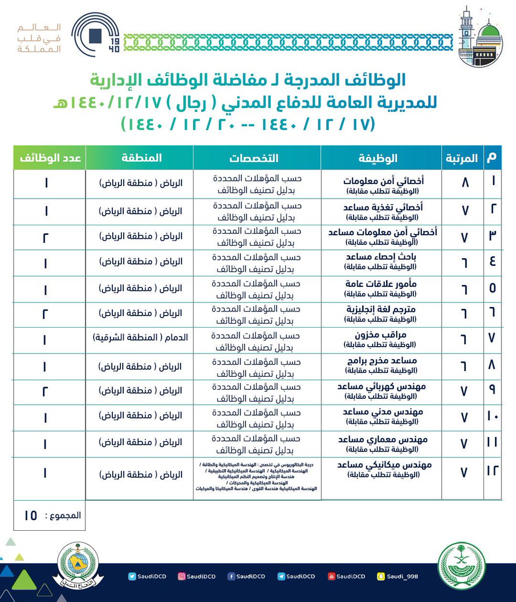 أعلنت المديرية العامة للدفاع المدني الخريجين والخريجات للتقدم على شغل (18) وظيفة إدارية في مدينتي (الرياض، الدمام)، من خلال منظومة التوظيف جدارة، وذلك وفقاً للتفاصيل الموضحة أدناه.