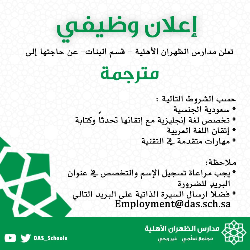 أعلنت مدارس الظهران الأهلية (قسم البنات) توفر وظائف شاغرة للنساء بمجال الترجمة، للعمل بمسمى (مُترجمة)، واشترطت المدارس أن تكون المتقدمة سعودية الجنسية، وذلك وفقاً للشروط وطريقة التقديم الموضحة أدناه.